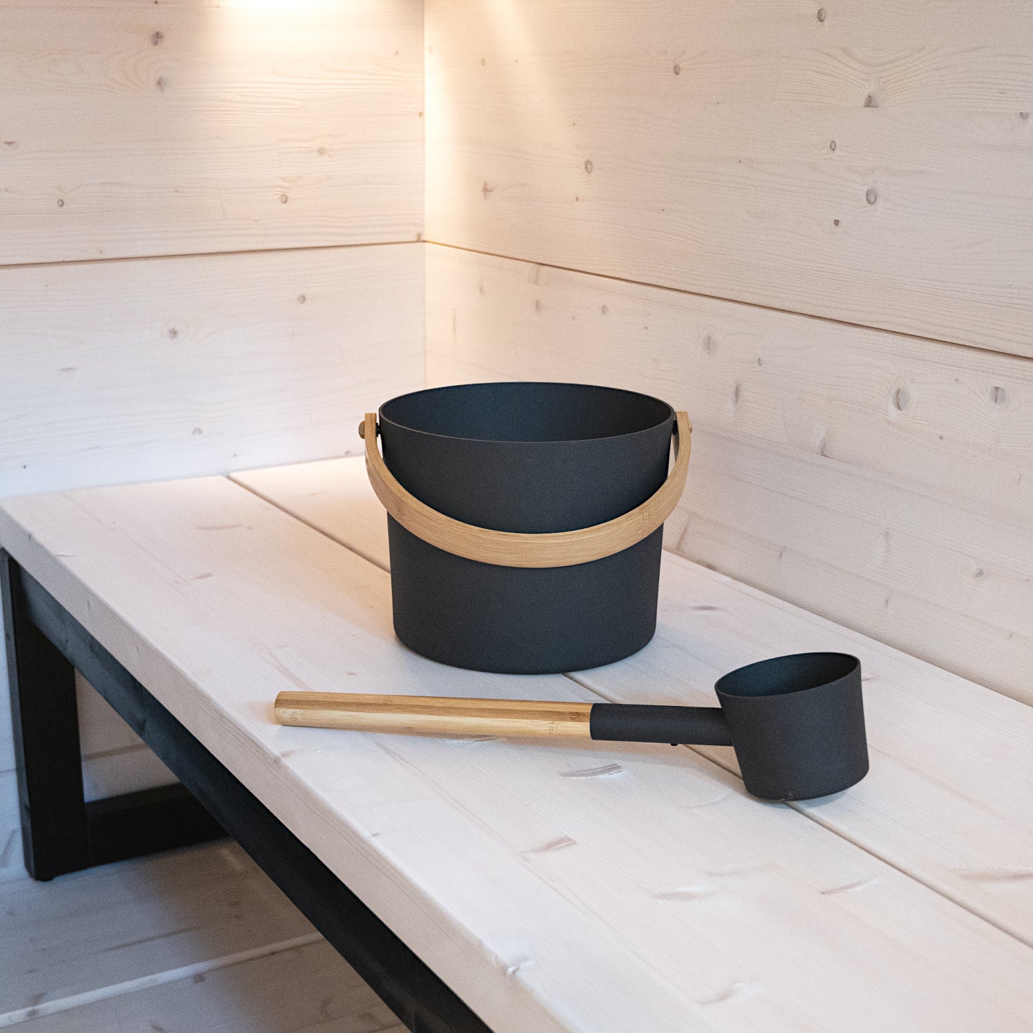 Harvia offers a stylish sauna pail and water ladle kit at a really affordable price. Made of plastic, this simple set is still elegant, functional and durable.
